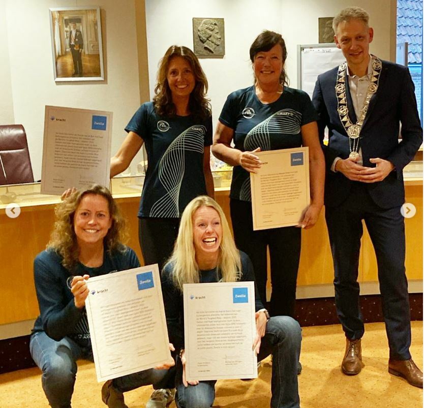 De vier Bue Atlanticsroeisters Ineke Karrenbelt, Ingrid Voorn, Marije van de Bor en Margot Vries zijn vrijdagmiddag gehuldigd door de gemeente Zwolle gehuldigd voor hun geweldige prestatie.