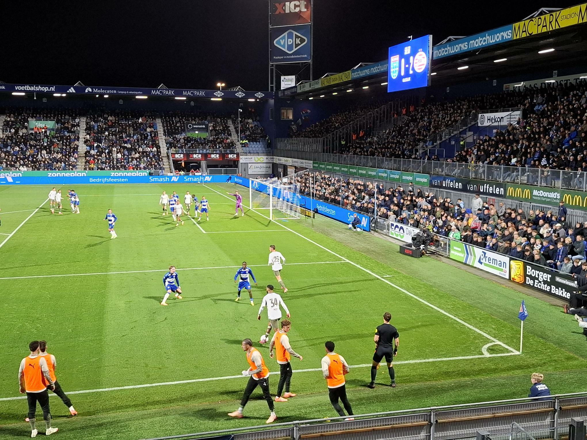 PEC Zwolle kwam halverwege de eerste helft op een 0-1 achterstand door een doelpunt van Ismaël Saibari die een voorzet van Couhaib Driouech binnenliep. Nadat een tweede Eindhovense treffer - ditmaal van Guus Til - vanwege buitenspel, scoorde PSV door Dennis Man alsnog voor rust de 0-2.